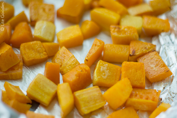 It’s pretty easy. Actually, you only need to prepare the butternut squash and then put all ingredients together. In a baking sheet, place butternut squash pieces (in one layer), season it with salt (just a little bit, you can add more later) and spray it with olive oil. Bake it under 400F preheated oven for 30 minutes. Change the oven function to “roast” and let it roasting for extra 5 to 8 minutes, or until it starts getting golden brown. After ready, let it cool down.