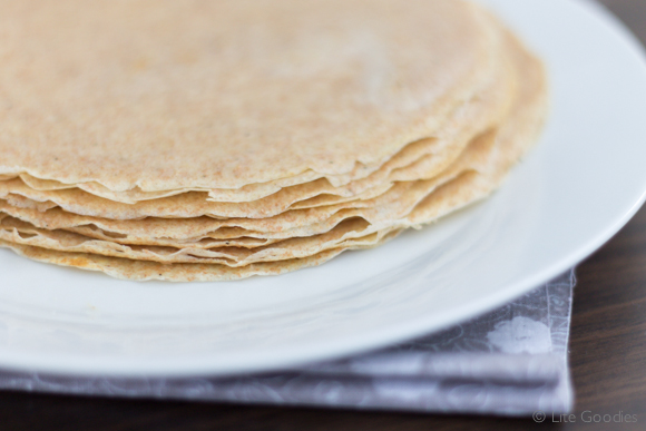 Heat a 10″ non-stick pan (use low heat). Add 1/8 tbp coconut oil to coat … use a paper towel to spread the oil over the pan and also to take off any excess (because I didn’t put oil in the crepe mixture, I repeated this step for each crepe). Pour 1/4 cup batter into the center of the pan and swirl to spread evenly. Cook until the edges of the crepe start to curl and the top looks almost dry (about 1-2 minutes). Flip the crepe and continue to cook for about 30 seconds or until you have brown spots over the surface. Place the crepe in a plate and continue the process until all the batter is gone.